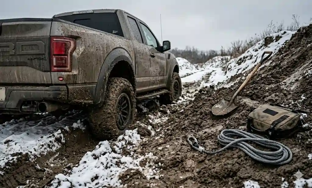 - The “Belly” Problem: If you drive into a deep snowdrift or a mud hole and the bottom of your truck (the “belly”) touches the ground, your tires will just hang in the air. In this case, no amount of grip from TruckClaws or chains will help because the tires aren’t pressing down hard enough. You must first use a shovel to clear the path under the truck so the weight rests back on the tires.